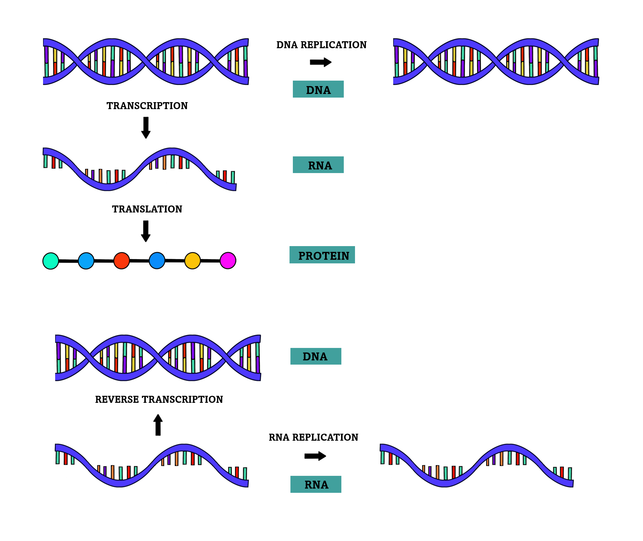However, it was discovered that genetic information can be passed in other ways. In retroviruses, it is possible to transfer information from RNA to DNA - this is called reverse transcription. What is more, some RNA viruses replicate their RNA - RNA replication.
