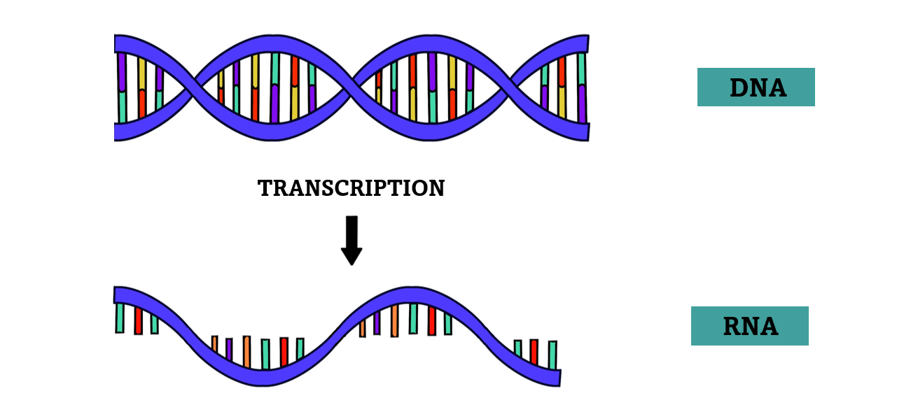 In transcription, an RNA molecule is synthesized based on the information stored in the DNA. In other words, the DNA code (usually containing information on how to synthesize a protein) is transcribed (rewritten) into RNA. Here, the information passes from DNA to RNA.