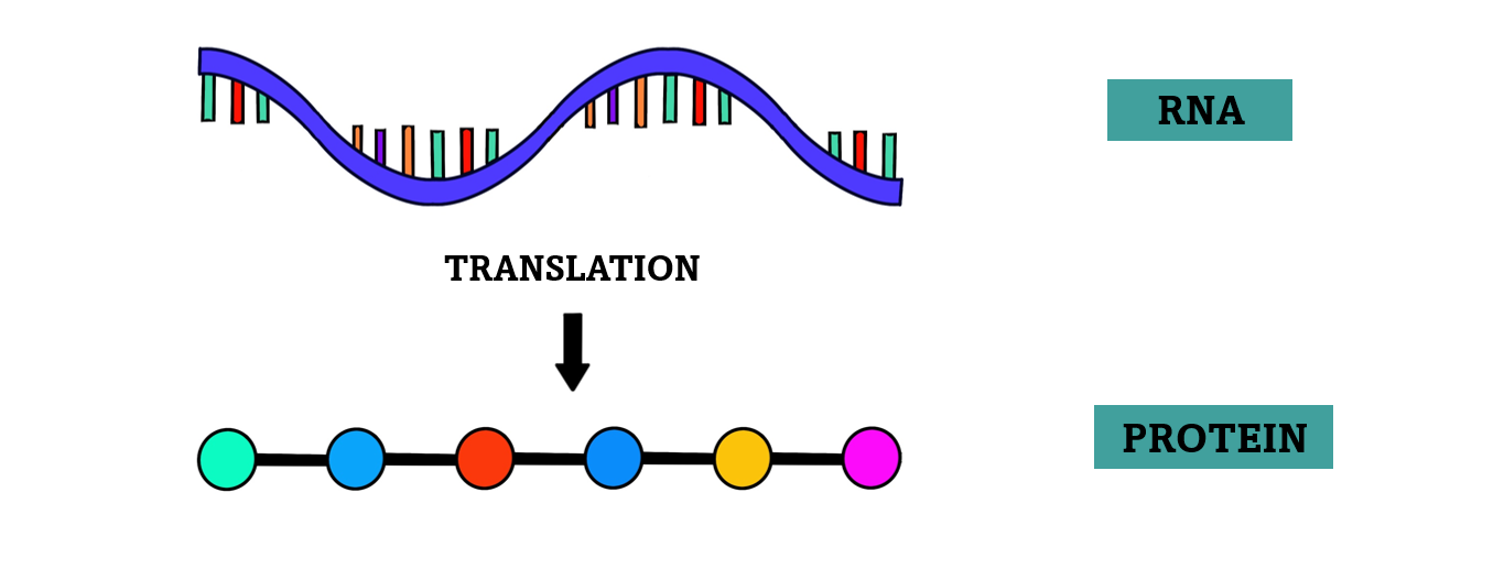 In translation, a protein is synthesized from the transcribed RNA molecule. The information therefore passes from RNA to protein.
