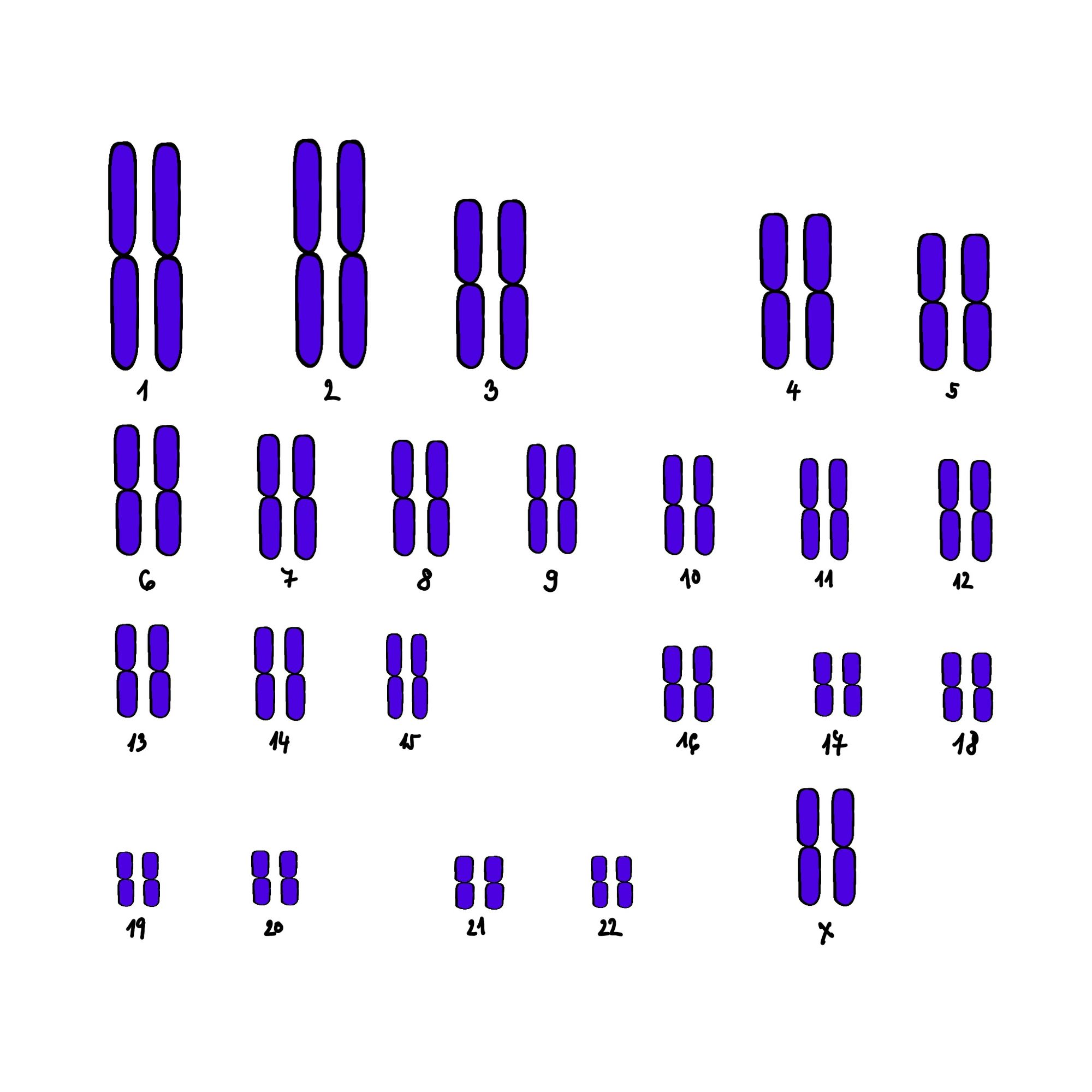 In humans, there are 24 types of chromosomes. There are 22 chromosomes that are numbered from 1 to 22 and these we call autosomes. Then, there are two sex chromosomes X and Y. As you probably know, men have one X chromosome and one Y chromosome. Women, on the other hand, have two X chromosomes. Human cells contain 2 copies of each chromosome - that means, 2 copies of chromosome 1, chromosome 2, etc., together making 46 chromosomes in total. There are, however, some cells that don't have follow this rule, e.g. germ cells, which only have 1 copy of each chromosome. A full set of these 46 chromosomes is called a karyotype.