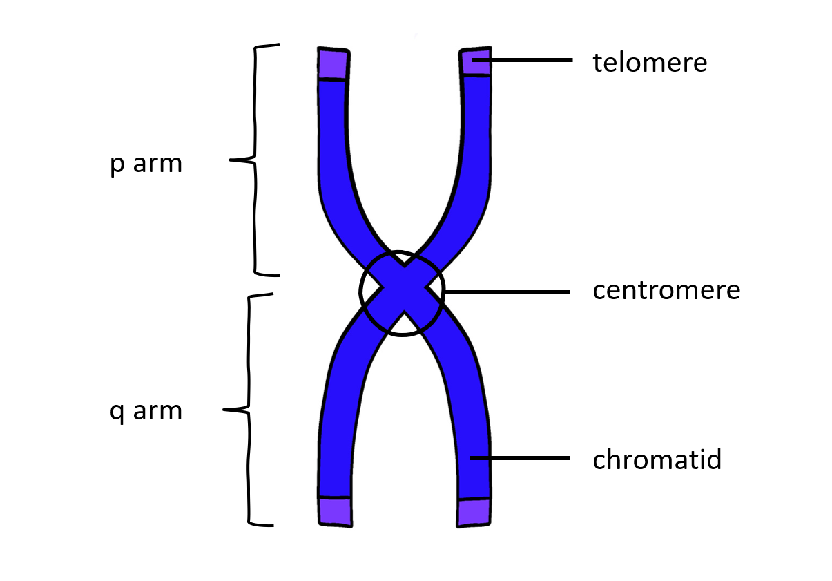 A chromosome has two arms - a p arm and a q arm. Between the two arms, there is a structure called centromere, which is very important during mitosis. At each end of a chromosome is a telemore, which protects the ends of a chromosome and is responsible for their proper replication. Every chromosome consists of 1 molecule of DNA and proteins. Together, they form a centromere. Here, you can see two centromeres because we're looking at a picture of a chromosome after replication, in other words, a chromosome with 2 molecules of DNA.