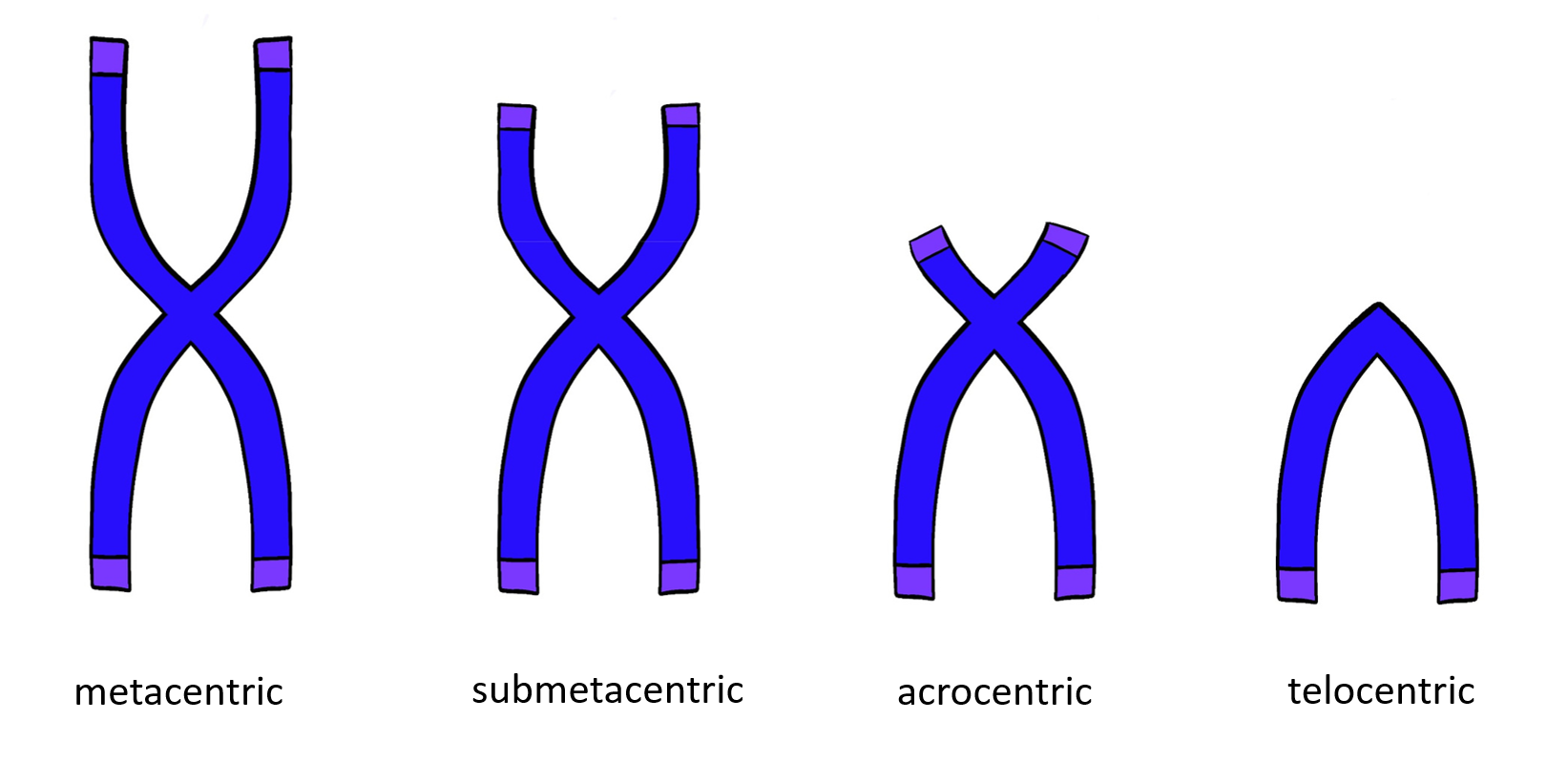 Chromosomes vary in size and structure. For that reason, we distinguish different types of chromosomes. Metacentric chromosomes have p a q arm of the same length. Submetacentric chromosomes have their p arm shorter than their q arm. Acrocentric chromosomes have very short p arm. Telocentric chromosomes have only q arms.