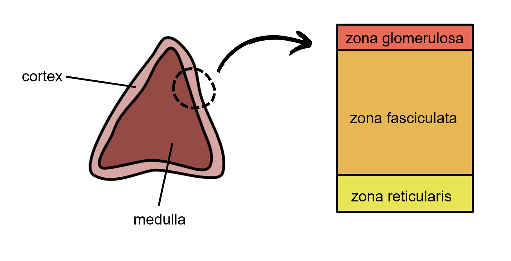 Cortisol is produced and secreted by the adrenal glands, which consist of two parts: the adrenal cortex and the adrenal medulla. The adrenal medulla secretes catecholamines, epinephrine and norepinephrine, and the adrenal cortex secretes cortisol together with other hormones. The cortex itself consists of three parts: zona glomerulosa, zona fasciculata, and zona reticularis and each secretes a different hormone. Cortisol is secreted by zona fasciculata. It is classified as a glucocorticoid. Glucocorticoids are hormones that increase glucose concentration in blood which is one of cortisol's effects.