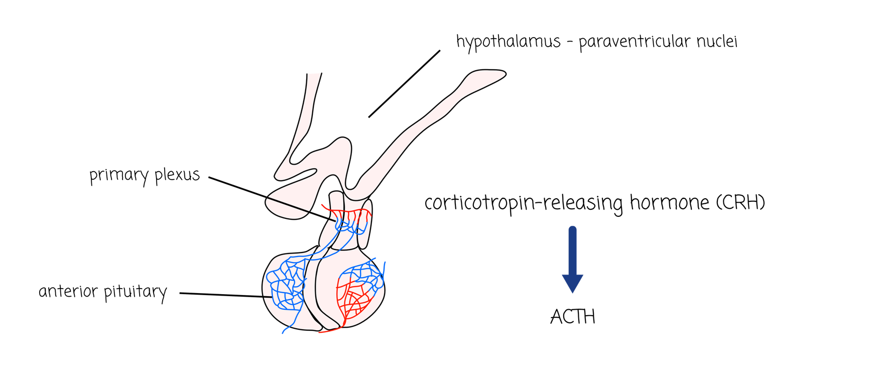 Cortisol is regulated by the adrenocorticotropic hormone (ACTH), which is secreted by the anterior pituitary. However, in order for the adrenocorticotropic hormone to be synthesized, there's a few steps that have to be followed. First, the so-called corticotropin-releasing hormone (CRH) has to be secreted by the cells of the paraventricular nuclei in the hypothalamus, which gets a signal from the central nervous system that cortisol is needed. Corticotropin-releasing hormone then gets by the primary capillary plexus to the anterior pituitary and here it stimulates the secretion of adrenocorticotropic hormone, which in turn stimulates the secretion of cortisol. Of course, both ACTH and CRH follow cortisol’s diurnal pattern.