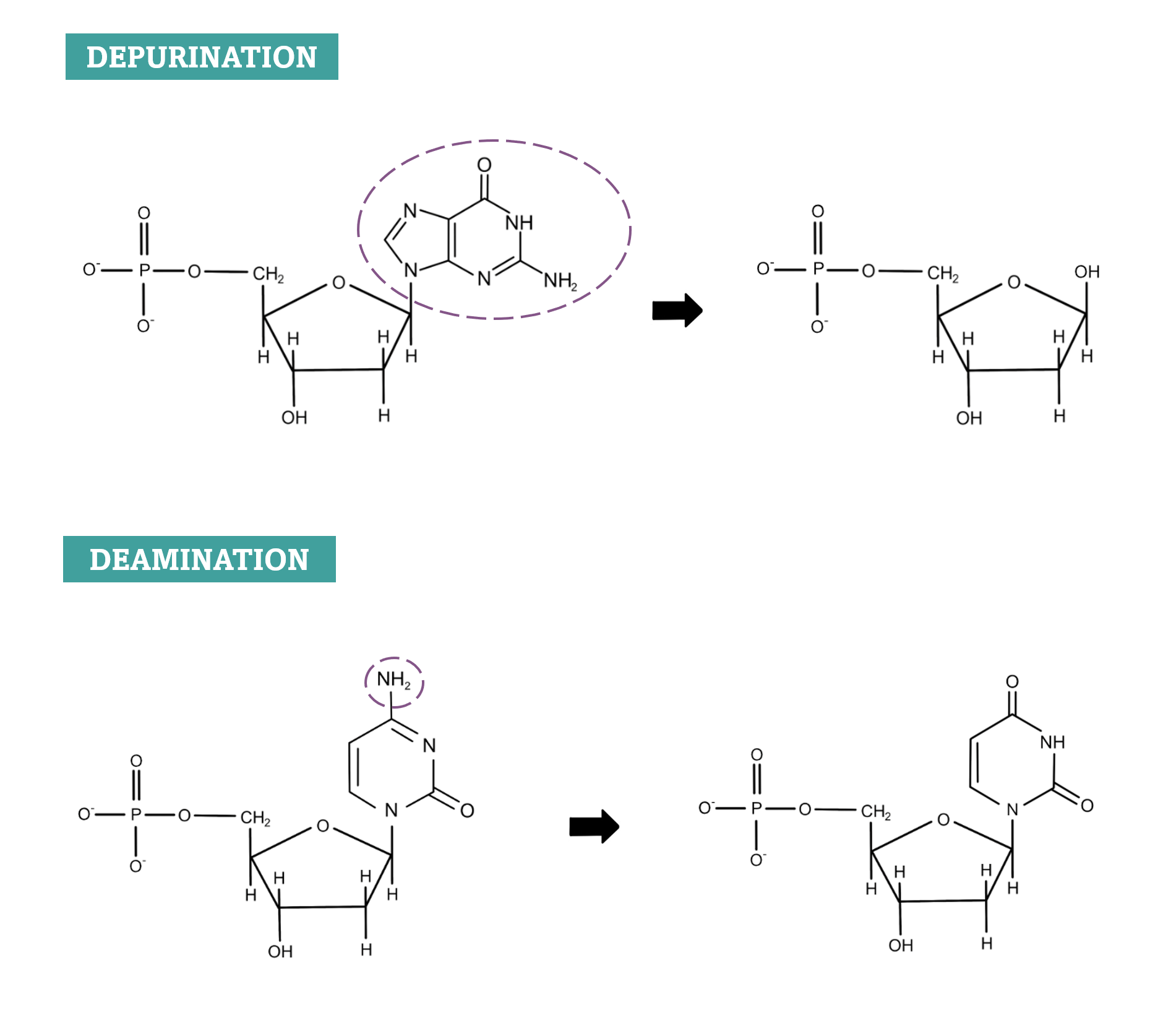 Mutations that occur randomly, for example by an error in DNA replication, are called spontaneous mutations. They can involve spontaneous chemical changes in DNA, such as depurination (the removal of a purine base from a nucleotide), depyrimidination (the removal of a pyrimidine base from a nucleotide), or deamination (the removal of an amino acid group from cytosine (usually) producing uracil).