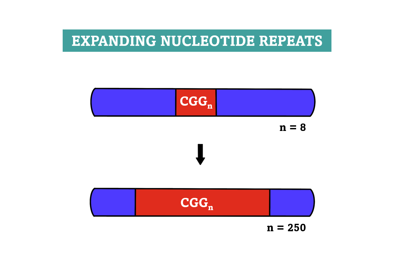 Another interesting type of mutation are the expanding nucleotide repeats. These mutations increase the number of copies of a set of nucleotides (usually three). These mutations cause, for example, the fragile X syndrome in which the number of copies of the CGG set of nucleotides located on the X chromosome increases up to 1500 copies. Expanding nucleotide repeats are also the cause of Huntington disease, Kennedy disease and many others.