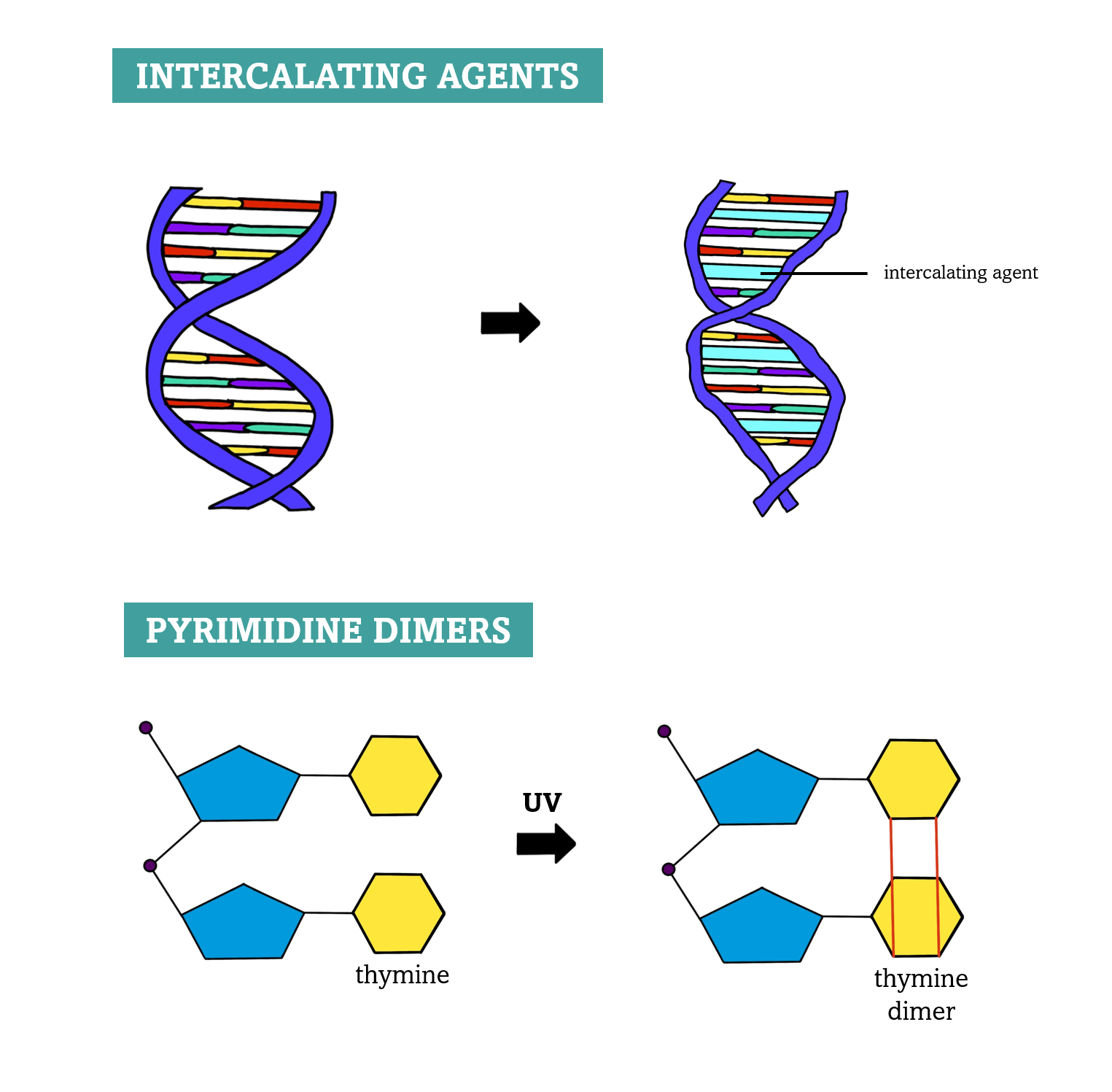 However, mutations can also be caused by chemical, biological or physical agents in the environment. These are called induced mutations. Some chemicals can induce deamination, which we mentioned earlier. Chemicals called base analogs have structures similar to the standard bases in DNA and as a result can be incorporated into newly synthesized DNA molecules during replication. Chemicals called alkylating agents donate alkyl groups (e.g., methyl (CH3-)) to nucleotide bases inducing all types of mutations. Chemicals referred to as intercalating agents (e.g., ethidium bromide) place themselves (intercalate) between adjacent bases in DNA damaging the helix structure and causing insertions and deletions in replication that often result in severe frameshift mutations. UV light can be quite damaging as it is absorbed by pyrimidine bases and it causes the formation of chemical bonds between adjacent pyrimidine molecules creating pyrimidine dimers (usually thymine) that often block replication.