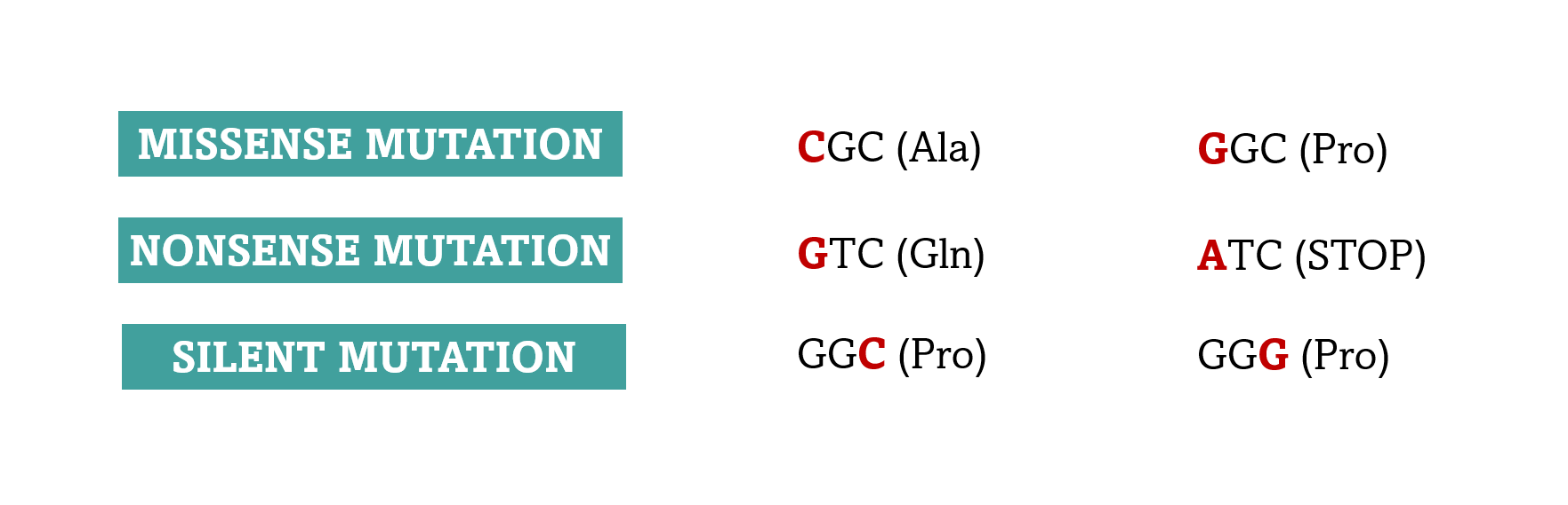 Another classification considers the effect the mutation has on the structure of a protein. A missense mutation is a base substitution that changes the codon in a way that a different amino acid is synthesized. A nonsense mutation changes a codon that specifies an amino acid into a stop codon. A silent mutation changes a codon that specifies a certain amino acid into a different codon that however specifies the same amino acid.