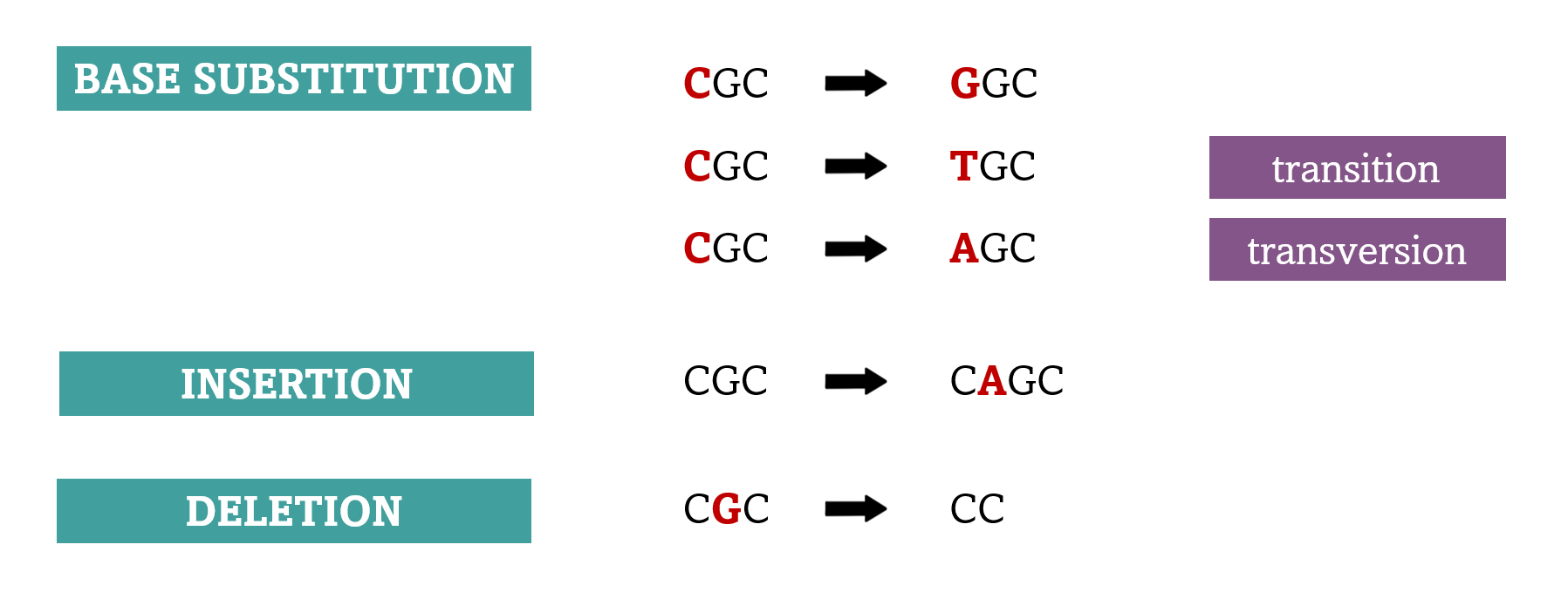 - types of mutations: somatic, germ-line, gene, chromosome, base substitution, transition, transversion, insertions, deletions, frameshift, forward, reverse, missense, nonsense, silent, suppressor, expanding nucleotide repeats, spontaneous, induced mutations