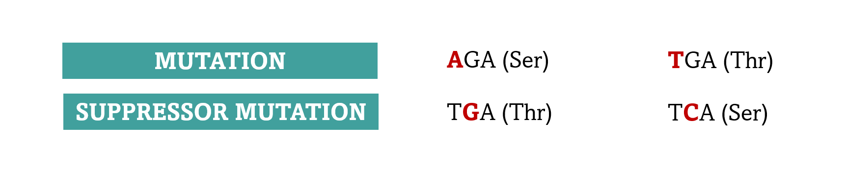 A special type of mutation is the suppressor mutation, which suppresses the effect of another mutation. There are two types of the suppressor mutation: 1) intragenic, 2) intergenic (extragenic). The intragenic suppressor mutation occurs in the gene where the mutation it suppresses is located. The intergenic (extragenic) suppressor mutation, on the other hand, occurs in a different gene than the one where the mutation it suppresses is located.