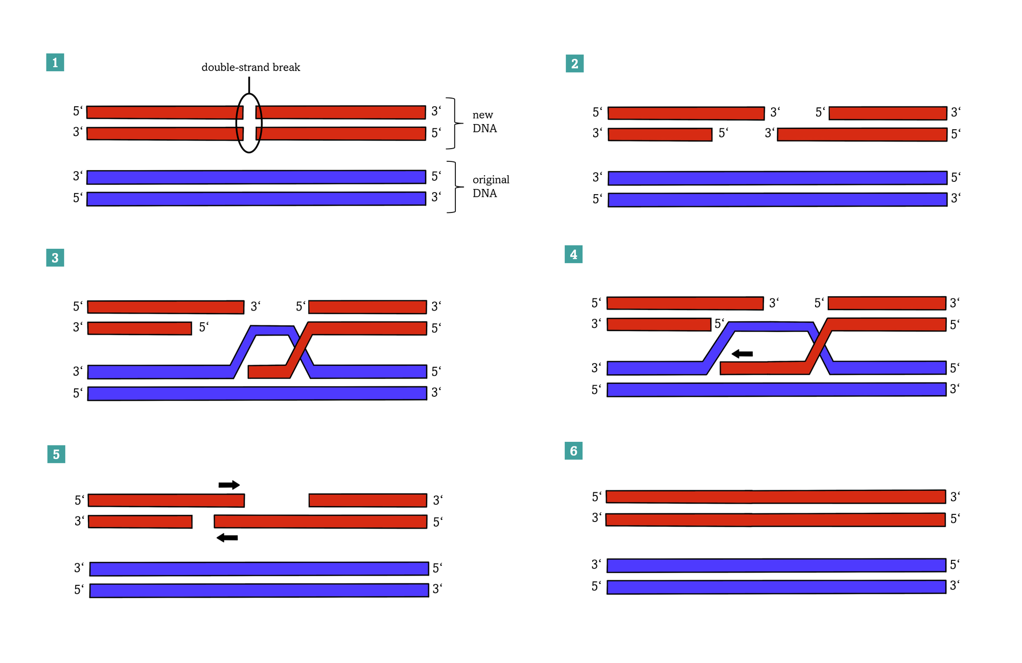 The homologous recombination, on the other hand, is very precise and can be used after DNA replication when there are two double-helixes, and one gets damaged. First, a nuclease removes the 5'-ends of the two broken strands at the break. Then, one of the broken 3'-ends pairs with the unbroken DNA double-helix to use it as a complementary strand. The DNA polymerase elongates the strand, and the strand then rejoins the second broken strand. Finally, the rest of the missing DNA is synthesized and then joined by DNA ligase. The reason we call homologous recombination homologous is because it uses a homologous template – a template that contains the same genetic information as the one that is in the damaged strand (homologous means the same or similar). Nonhomologous end joining does not use such a template and that is why we call it nonhomologous.