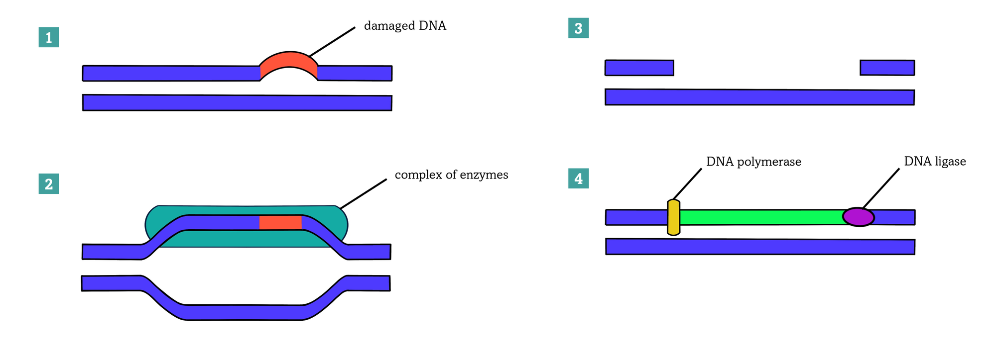 Another important mechanism is called excision repair. There are two types of excision repair: 1) base excision repair, 2) nucleotide excision repair. In base excision repair an incorrect base is removed from the DNA using the general steps of DNA repair described above. Nucleotide excision repair is used to repair more serious damage to the DNA, such as thymine dimers that distort the double helix. It uses a complex of enzymes that finds the distorted part of the DNA and separates its two strands. The damaged part of the strand is removed, and the gap is filled in by DNA polymerase. DNA ligase then again joins the newly synthesized nucleotides with the undamaged DNA strand.