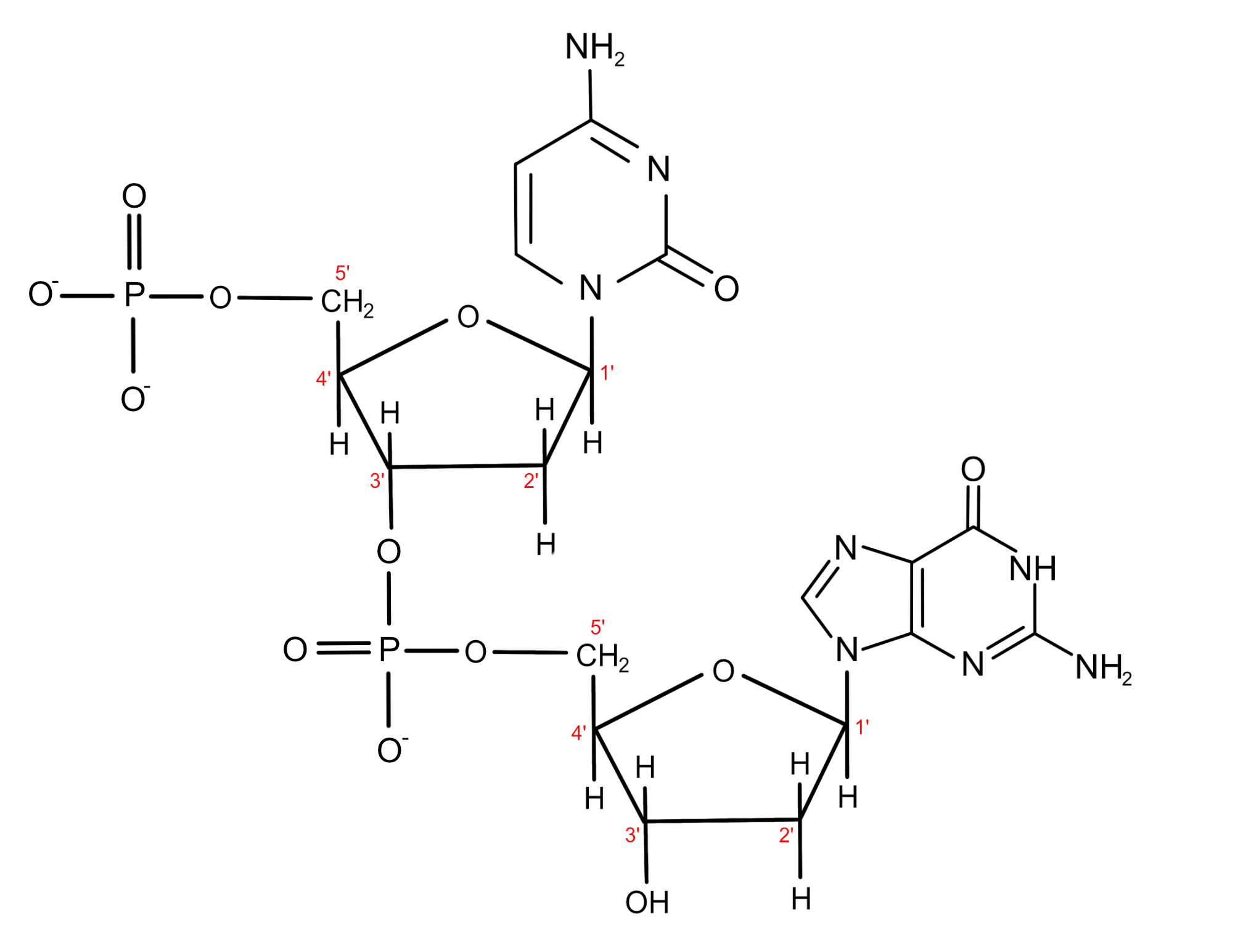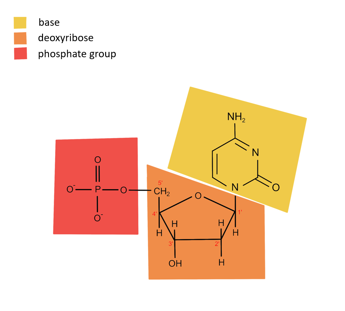 In DNA, the five-carbon sugar is 2-deoxyribose, hence the name deoxyribonucleic acid. 2-deoxyribose is, as we said, composed of 5 carbon atoms numbered 1' to 5'. The difference between deoxyribose and ribose is that ribose has an -OH group on its 2'-carbon, whereas deoxyribose only an H atom.