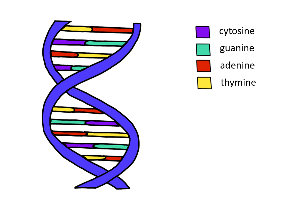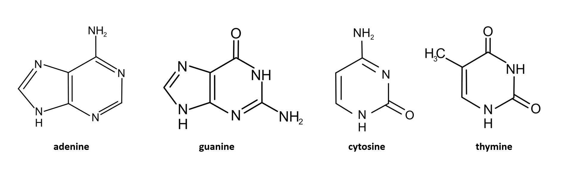 There are four different bases in DNA: adenine (A), guanine (G), thymine (T), and cytosine (C). Adenine and guanine are double-ring bases called purines. Cytosine and thymine are single-ring bases called pyrimidines.