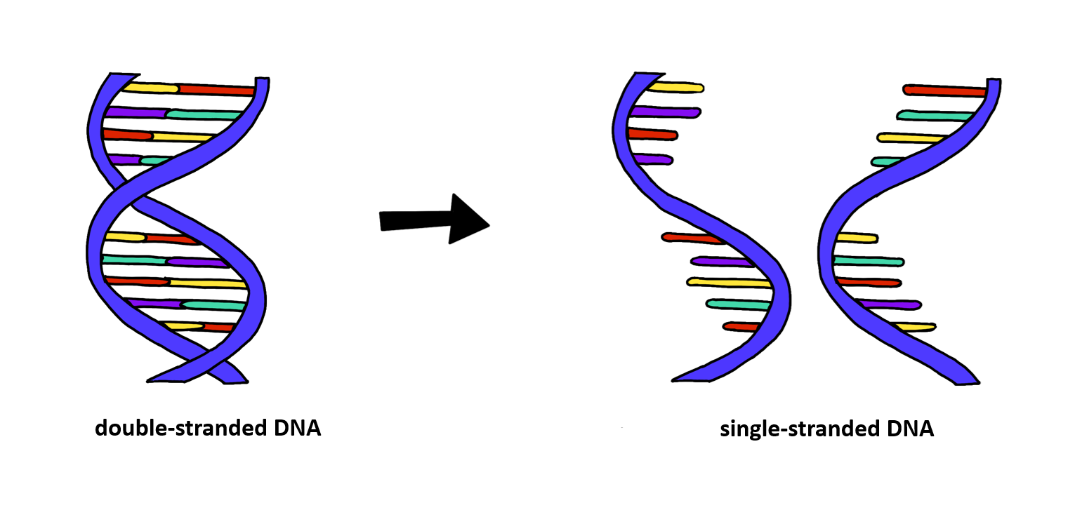 DNA that has two chains is referred to as dsDNA (double-stranded DNA). DNA that has only one chain is referred to as ssDNA (single-stranded DNA). The two chains of DNA can be separated during a process called DNA denaturation, when we heat the DNA to temperatures around 90°C. By slowly decreasing the temperature, the two chains will come together, forming the double helix again. This is called DNA renaturation or hybridization.
