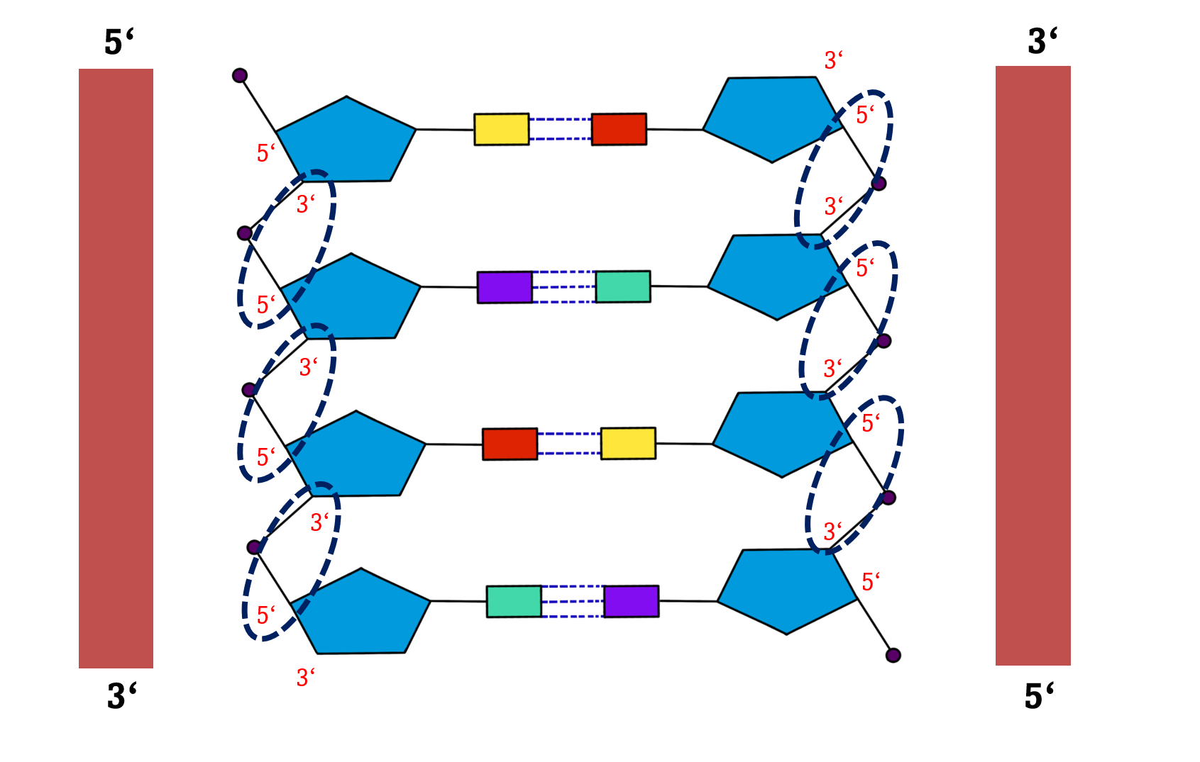 These polynucleotide chains are also said to be antiparallel. This means that the phosphodiester bonds that join the adjacent nucleotides go from a 3'-carbon of one nucleotide to a 5'-carbon of the adjacent nucleotide in one chain, and from a 5'-carbon to 3'-carbon in the other chain. Simply said, the two chains run in a different direction.