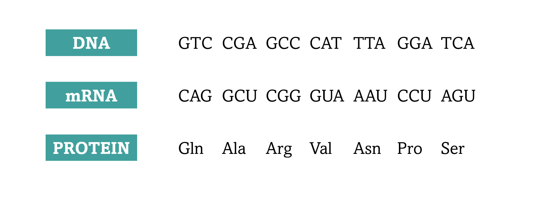 To synthesize a protein, the nucleotide sequence of the gene that codes for a protein is transcribed into mRNA (transcription). Then, the information is translated on the ribosomes into the actual amino acid sequence of a protein, with each group of three nucleotides, a codon, specifying one amino acid (translation). This set of rules by which we transcribe and translate the information in a gene is the genetic code.