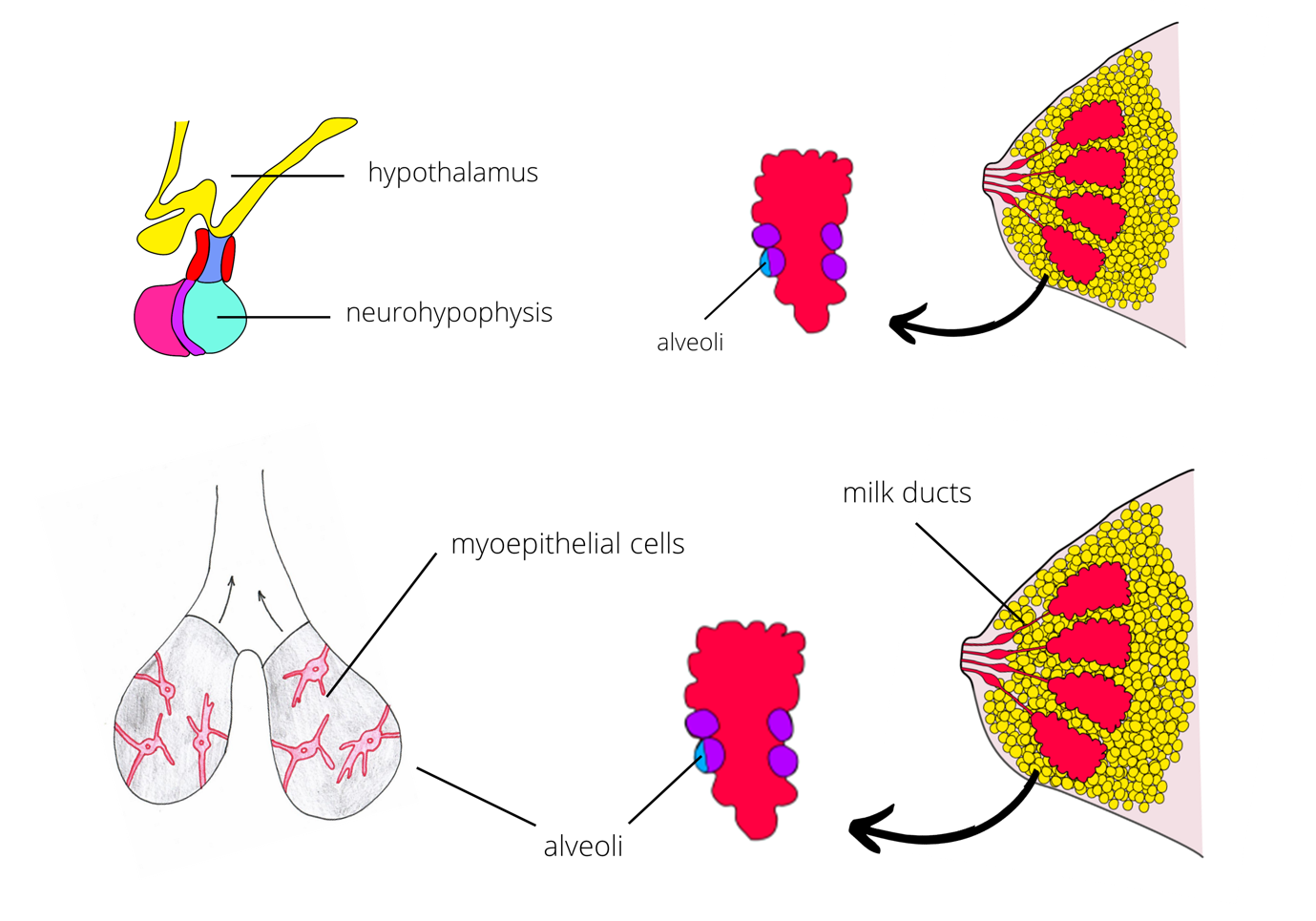 Oxytocin is responsible for milk ejection from the breasts after pregnancy. The milk is stored in alveoli in the mammary gland. When a baby suckles, sensory receptors in the nipple get stimulated and this stimulus is then transported to hypothalamus, which causes neurohypophysis to release oxytocin. Then, oxytocin in transported by blood to the breasts and here it causes contraction of myoepithelial cells around the alveoli and this contraction forces the milk into milk ducts and eventually into the nipple. This process is called milk ejection or milk letdown.