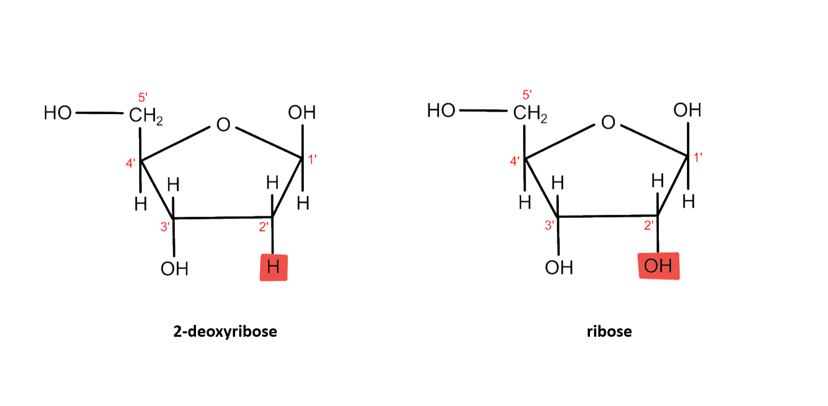In RNA, however, the five-carbon sugar is ribose, hence the name ribonucleic acid. The difference between 2-deoxyribose found in DNA and ribose is that ribose has an -OH group on its 2'-carbon, whereas deoxyribose only an H atom.