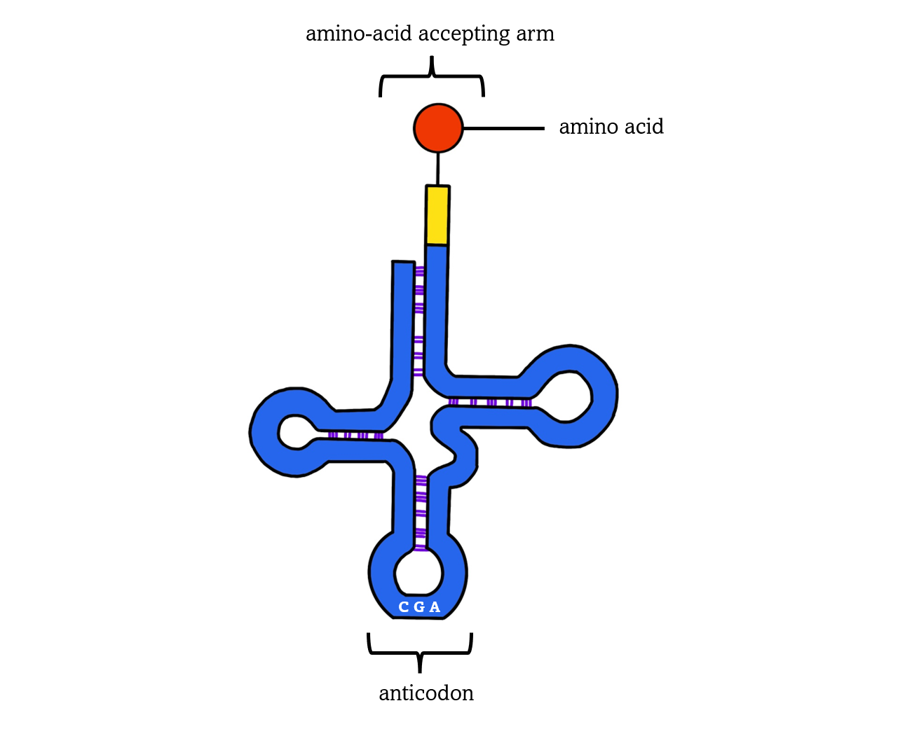 Transfer RNA is a molecule that brings amino acids to the ribosome during translation, the process in which a protein is synthesized based on the rewritten information in mRNA. tRNA has a specific structure because it contains four short double-helical segments making the molecule look like a cloverleaf. Two of these regions are important: 1) anticodon, three nucleotides that bind (through base-pairing) to a complementary codon in the mRNA molecule to ensure that a correct amino acid is added to the protein; 2) amino-acid-accepting arm, where the amino acid gets attached to the tRNA.